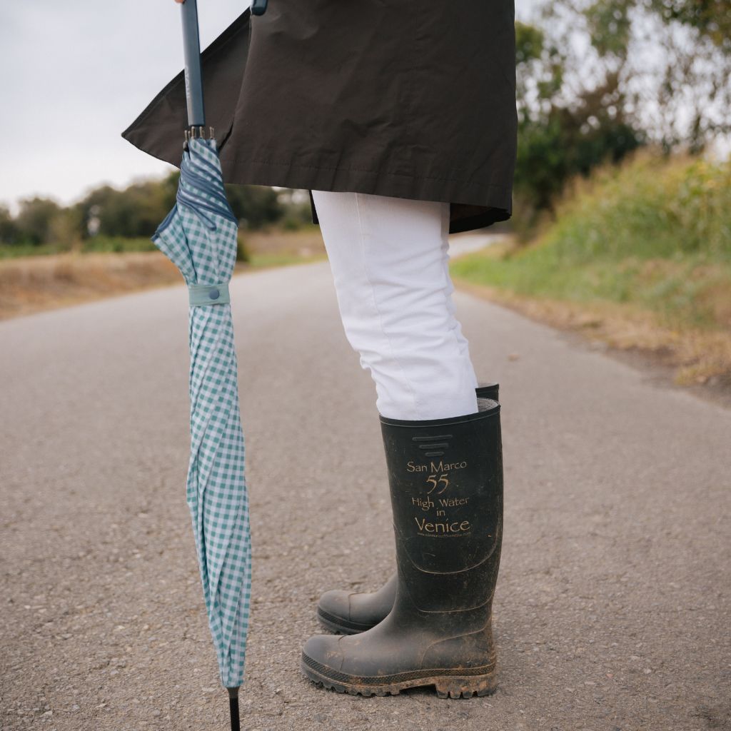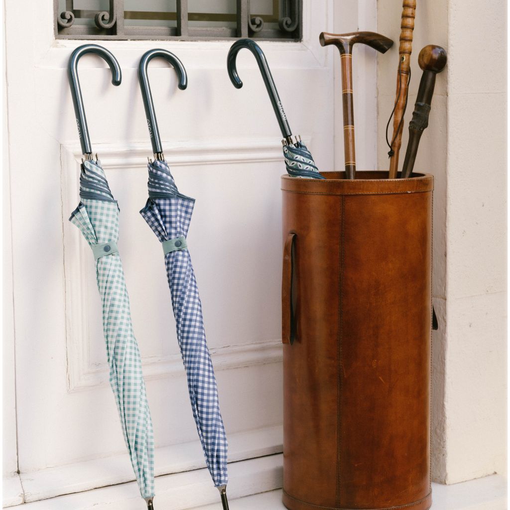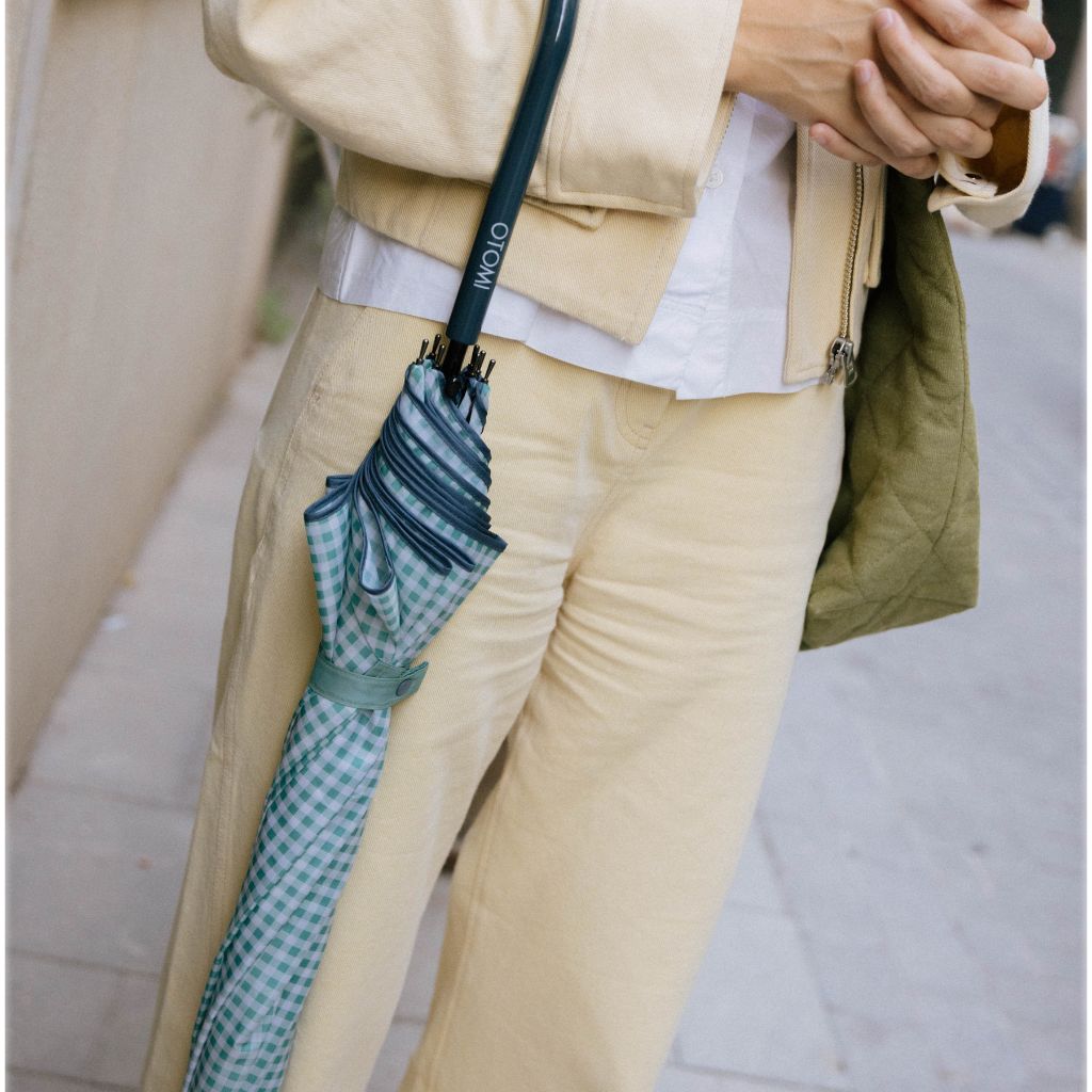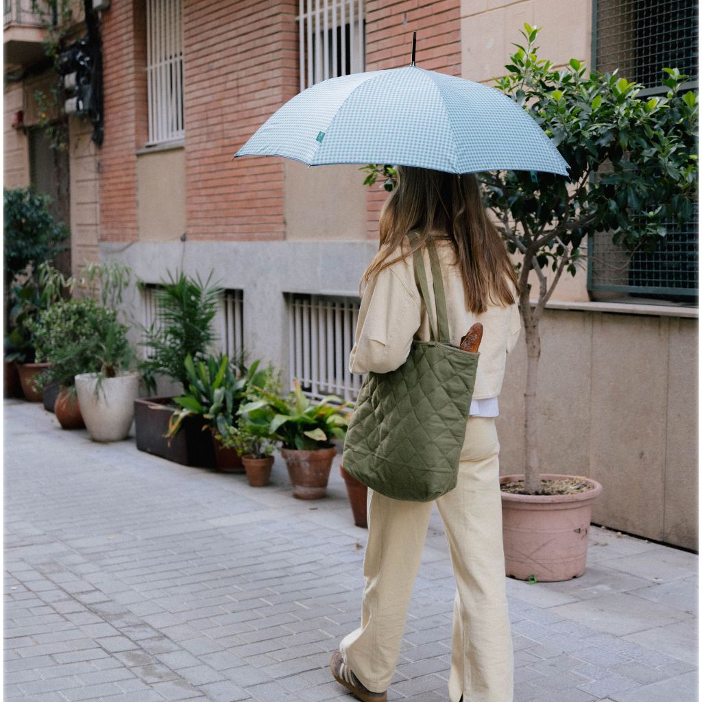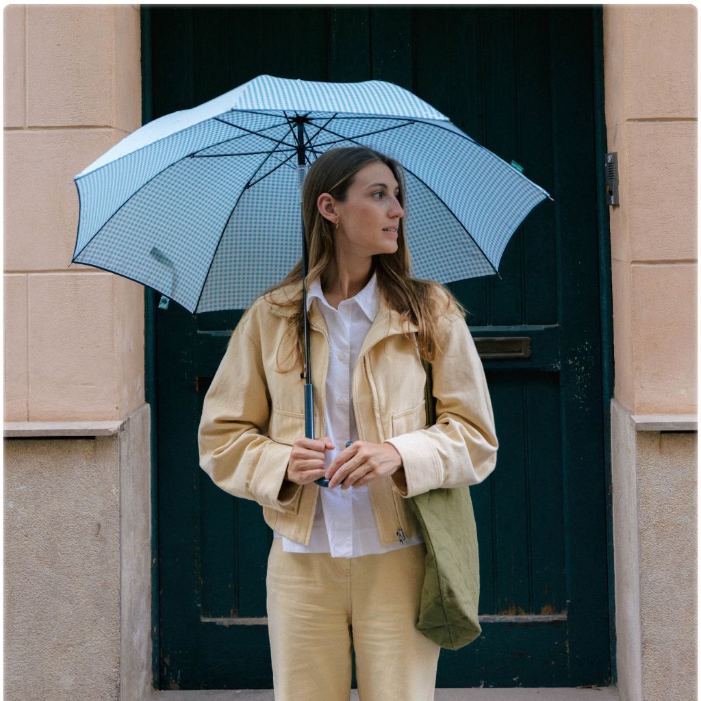Paraguas grande con estampado vichy verde turquesa. Un diseño muy elegante, clásico y atemporal que transformará los días de lluvia en momentos especiales.
